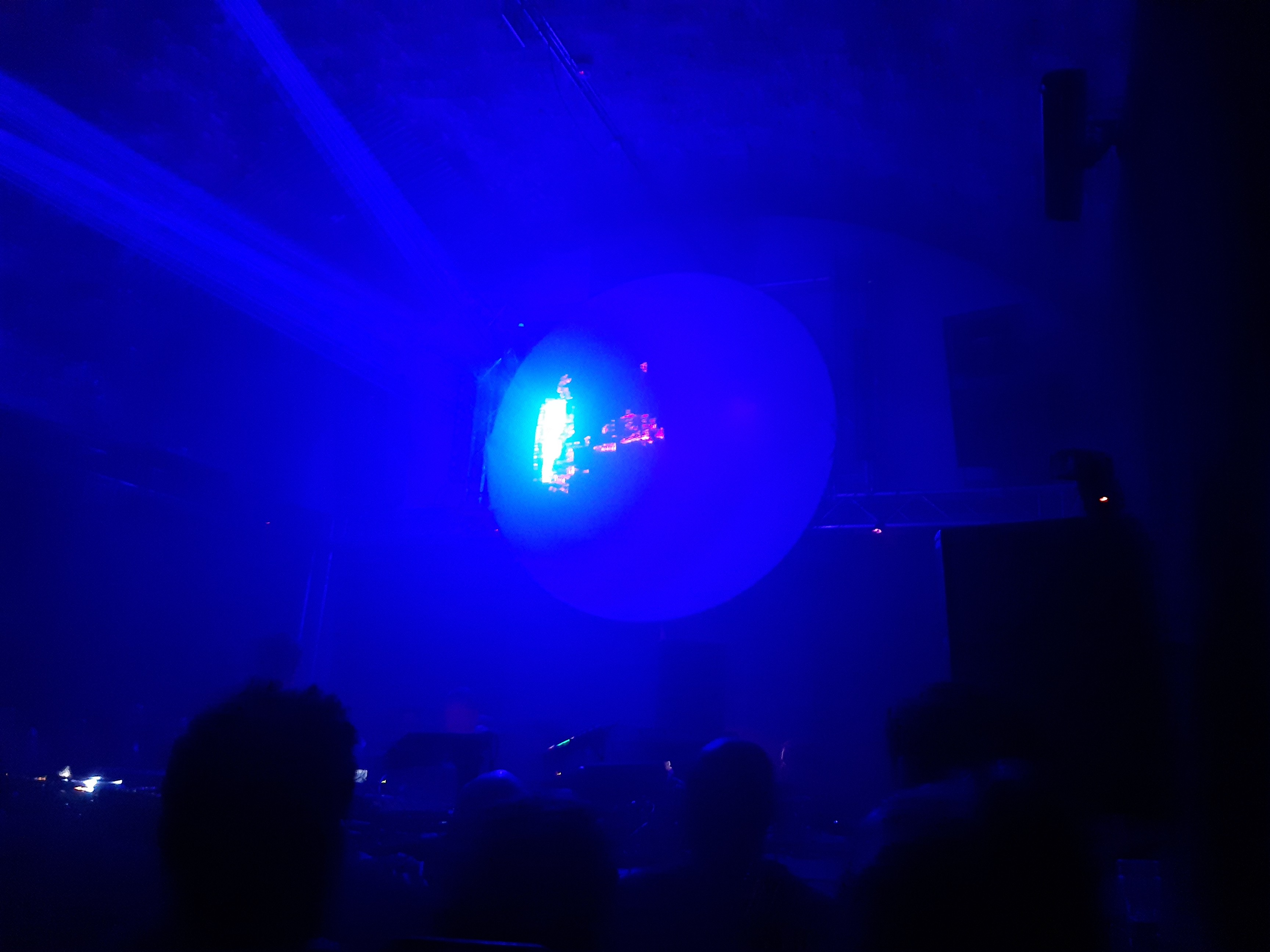 The circular screen dominated the arched room, welcoming us with a visual of a solar eclipse and setting the expected spacey atmosphere early. The pulled apart 3D shapes that followed were accompanied by a fade in of echoed, yet, stabbing sounds.